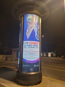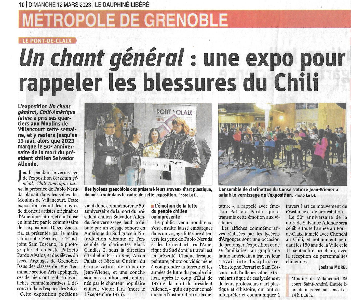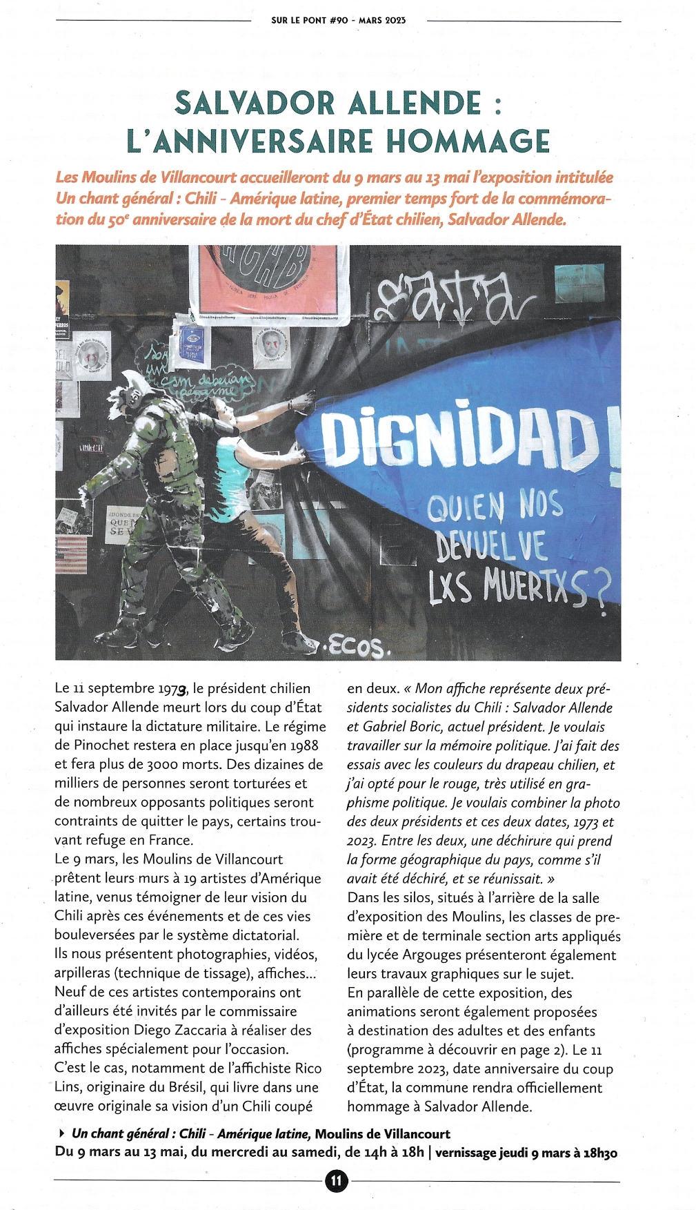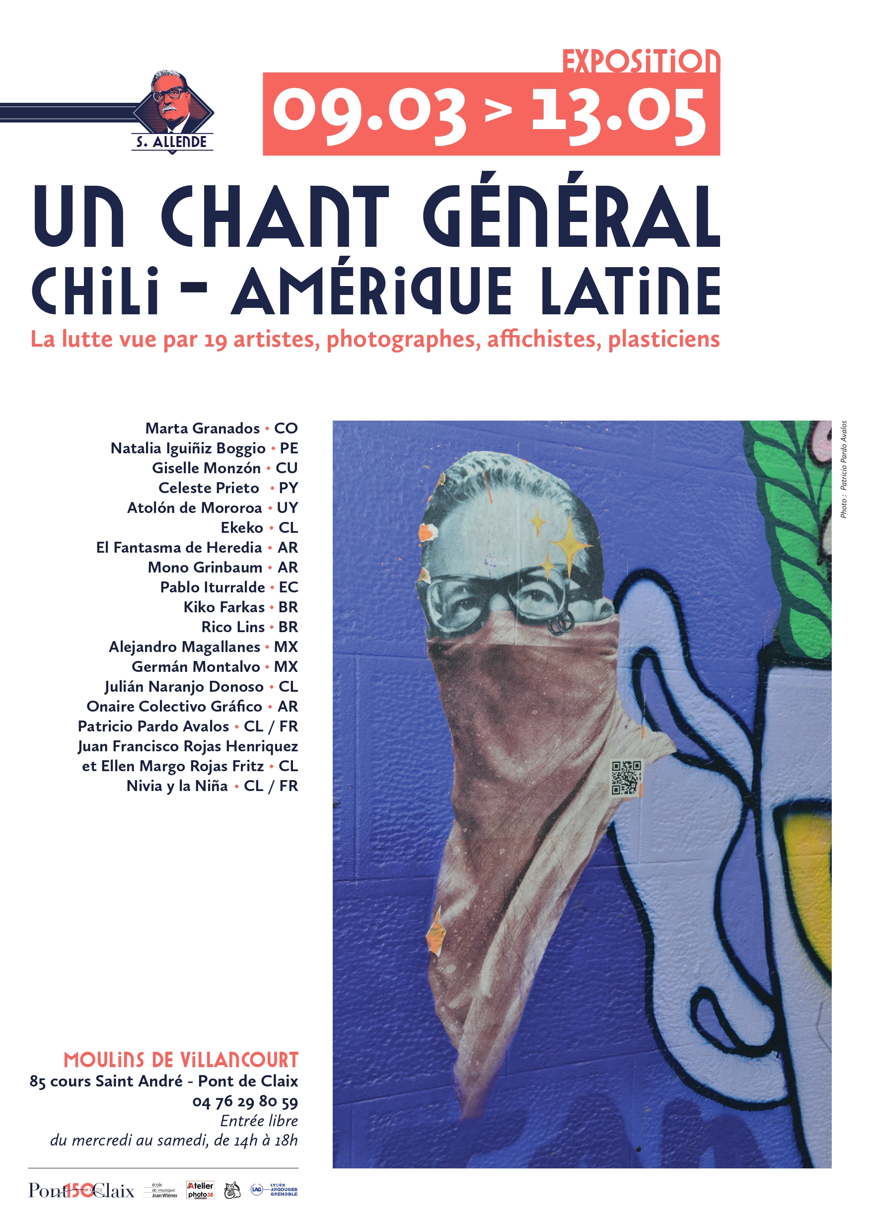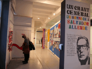 En ouverture des manifestations commémoratives, l’exposition Un chant général, Chili-Amérique latine, s’est déroulée du 9 mars au 13 mai 2023 . De nombreuses peintures murales expriment les revendications de la population chilienne, femmes, jeunes, et peuples autochtones en première ligne. Photographies, vidéos, affiches, arpilleras, recueillent cette parole quotidienne d’espoir et de crainte partagée par tous les pays d’Amérique latine.
