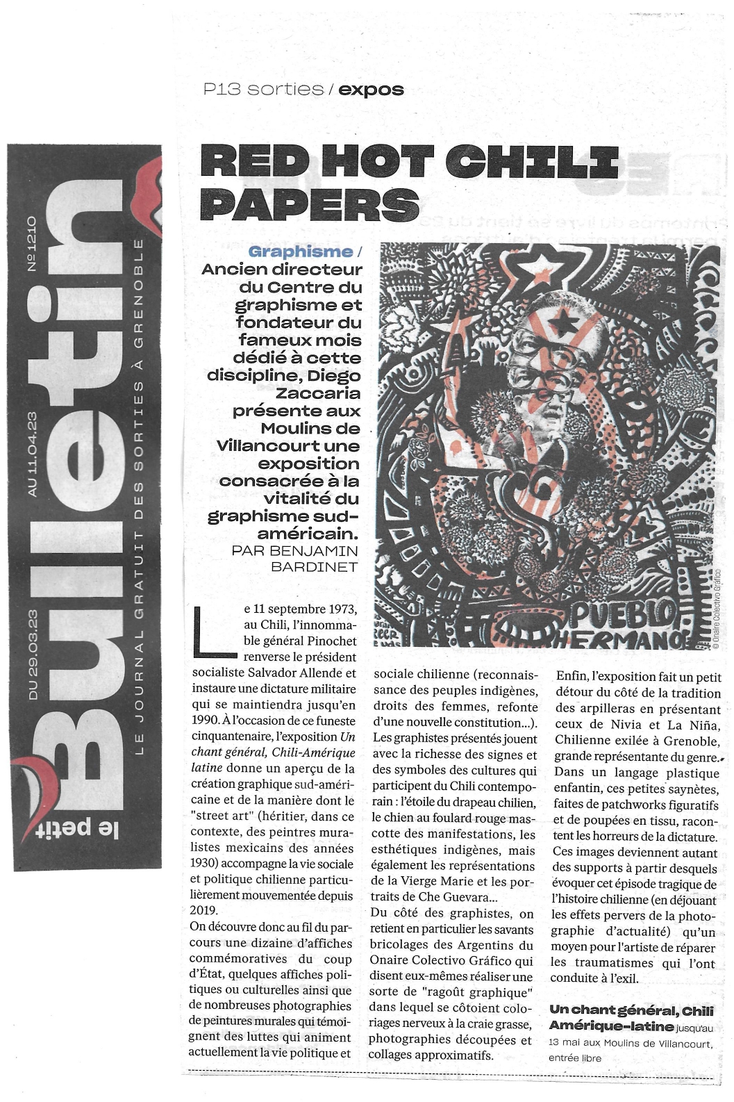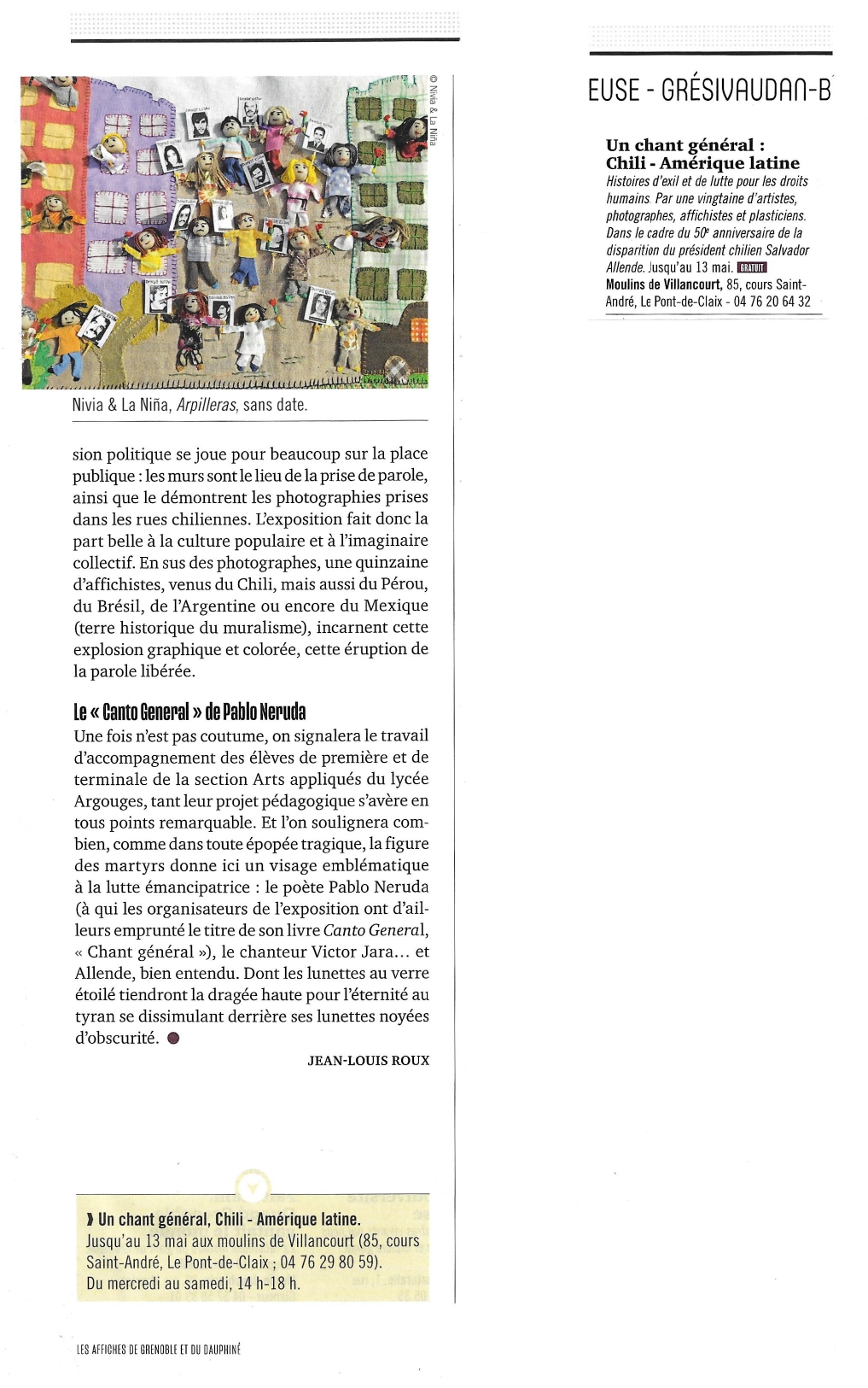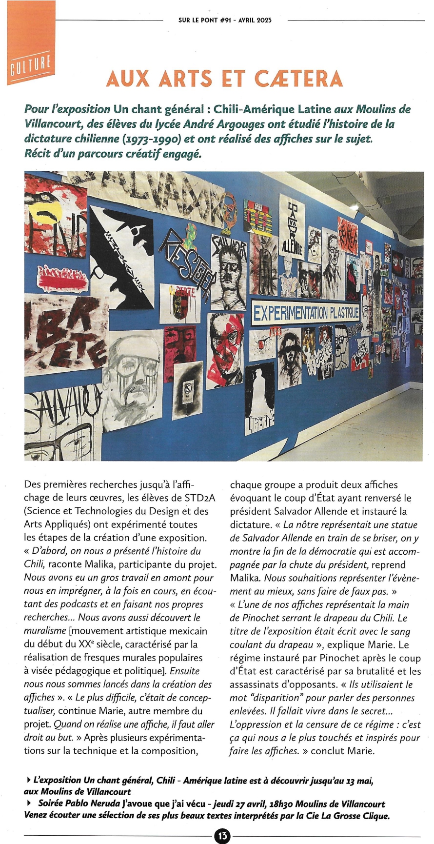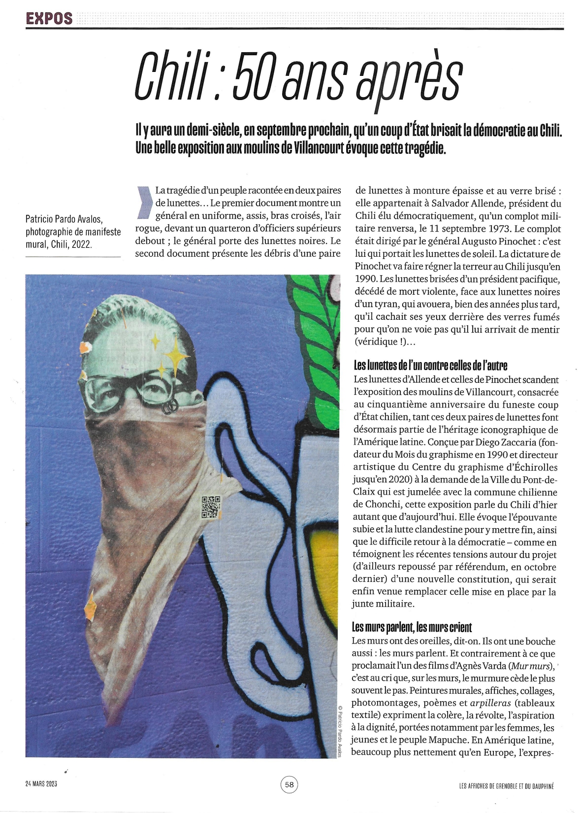 En ouverture des manifestations commémoratives, l’exposition Un chant général, Chili-Amérique latine, s’est déroulée du 9 mars au 13 mai 2023 . De nombreuses peintures murales expriment les revendications de la population chilienne, femmes, jeunes, et peuples autochtones en première ligne. Photographies, vidéos, affiches, arpilleras, recueillent cette parole quotidienne d’espoir et de crainte partagée par tous les pays d’Amérique latine.