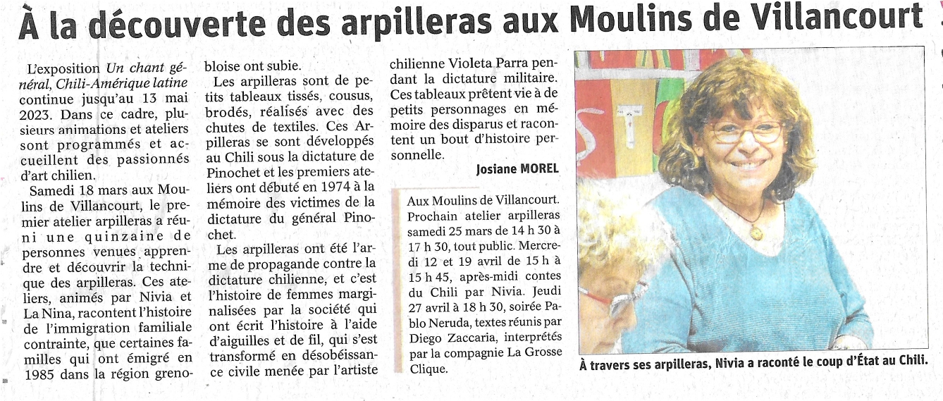 Nivia, artiste plasticienne, a fui le Chili avec sa famille, durant la dictature Pinochet. Depuis 1985, elle vit dans la région grenobloise avec la hantise de perdre la mémoire de ce qu’elle et des millions de Chiliens ont vécu durant cette période noire. Aussi, elle n’a de cesse de coudre et recoudre l’histoire de sa vie et de ses proches dans de magnifiques arpilleras.