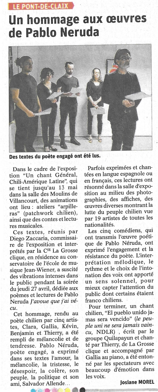 Le jeudi 27 avril 2023 la Compagnie La Grosse Clique a donné une représentation unique construite autour des poèmes et des mémoires du poète Pablo Neruda dans le cadre de l’exposition.